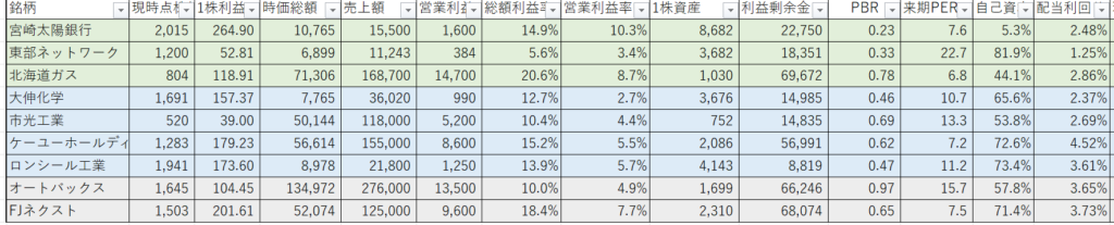 ・北海道ガス、東部ネットワーク、ケーユ―、宮崎太陽銀行、大伸化学、市光工業を軸にポートフォリを組んでおります。景気の影響を受けにくい内需中心にしております。また、オートバックス、FJネクストは優待のための長期保有のため単位株での保有です。