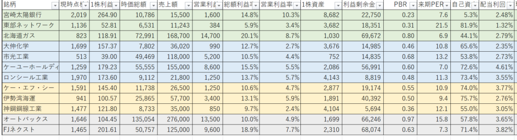 ・北海道ガス、東部ネットワーク、ケーユ―、宮崎太陽銀行、大伸化学、市光工業を軸にポートフォリを組んでおります。景気の影響を受けにくい内需中心にしております。また、オートバックス、FJネクストは優待のための長期保有のため単位株での保有です。
