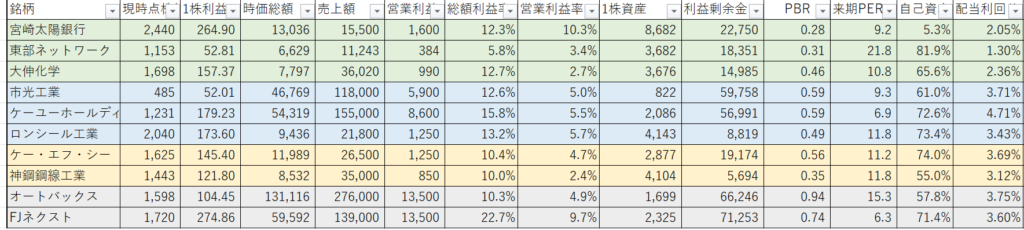 ・東部ネットワーク、ケーユ―、宮崎太陽銀行、大伸化学、市光工業を軸にポートフォリを組んでおります。景気の影響を受けにくい内需中心にしております。また、オートバックス、FJネクストは優待のための長期保有のため単位株での保有です。
