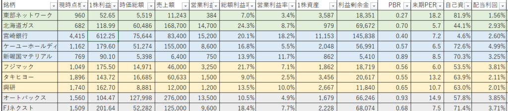 ・北海道ガス、東部ネットワーク、東祥、ケーユ―、宮崎銀行を軸にポートフォリを組んでおります。景気の影響を受けにくい内需中心にしております。また、オートバックス、FJネクストは優待のための長期保有のため単位株での保有です