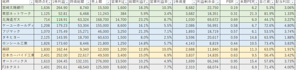 ・北海道ガス、東部ネットワーク、ケーユ―、宮崎太陽銀行を軸にポートフォリを組んでおります。景気の影響を受けにくい内需中心にしております。また、オートバックス、FJネクストは優待のための長期保有のため単位株での保有です。