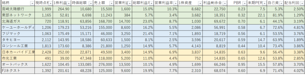 ・北海道ガス、東部ネットワーク、ケーユ―、宮崎太陽銀行を軸にポートフォリを組んでおります。景気の影響を受けにくい内需中心にしております。また、オートバックス、FJネクストは優待のための長期保有のため単位株での保有です。