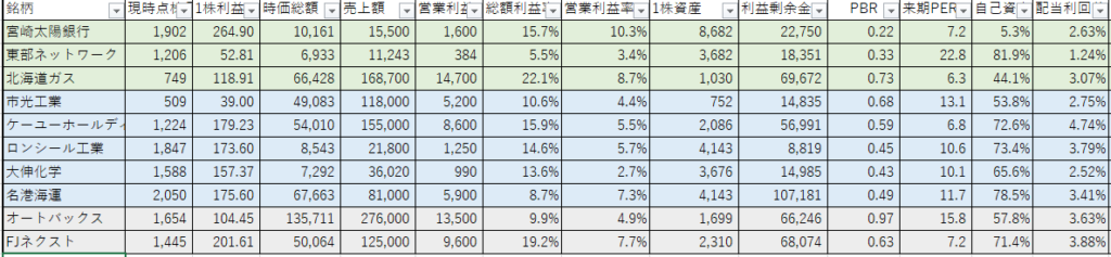 ・北海道ガス、東部ネットワーク、ケーユ―、宮崎太陽銀行を軸にポートフォリを組んでおります。景気の影響を受けにくい内需中心にしております。また、オートバックス、FJネクストは優待のための長期保有のため単位株での保有です。