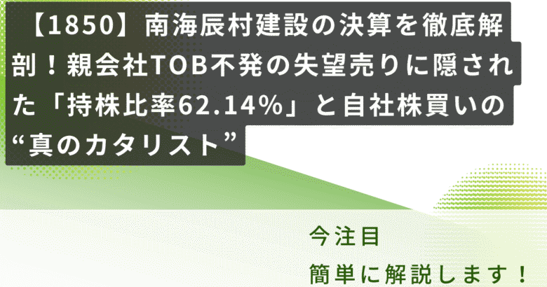 【1850】南海辰村建設の決算を徹底解剖!親会社TOB不発の失望売りに隠された「持株比率62.14%」と自社株買いの“真のカタリスト”