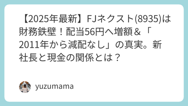 3月権利確定銘柄 【2025年最新】FJネクスト(8935)は財務鉄壁!配当56円へ増額&「2011年から減配なし」の真実。新社長と現金の関係とは? ただの高配当株じゃない?みなさん、こんにちは!ゆずママです。今日は、投資家の間でも「優待のハードルが高い(1000株!)」ことで有名な、あのFJネクストホールディングス (8935) を深掘りします。「優待が遠いならパスかな…」と思ったそこ... 2025.12.16 3月権利確定銘柄バリュー株株主優待