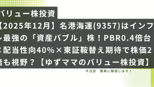 バリュー株 【2025年12月】名港海運(9357)はインフレ最強の「資産バブル」株!PBR0.4倍台×配当性向40%×東証鞍替え期待で株価2倍も視野?【ゆずママのバリュー株投資】 名証に眠る「黄金の土地持ち企業」を発掘!みなさん ゆずママです。今日は、サンタさんがプレゼントを持ってくる袋のように、**「中身がパンパンに詰まっているのに、なぜか激安で放置されている」**銘柄をご紹介します。その名は……**「名港海運 (... 2025.12.30 バリュー株