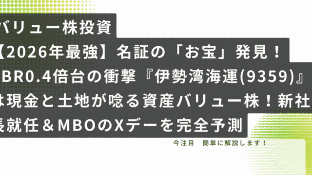 バリュー株 【2026年最強】名証の「お宝」発見!PBR0.4倍台の衝撃『伊勢湾海運(9359)』は現金と土地が唸る資産バリュー株!新社長就任&MBOのXデーを完全予測 こんにちは、ゆずママです!🍋みなさん、株式市場には**「東証(東京証券取引所)」**以外にも、お宝が眠る場所があるのをご存知ですか?そう、**「名証(名古屋証券取引所)」**です。🏯今日ご紹介するのは、その名証プレミア市場に上場する、名古屋... 2026.02.05 バリュー株
