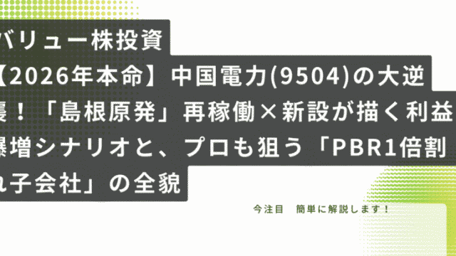 バリュー株 【2026年本命】中国電力(9504)の大逆襲!「島根原発」再稼働×新設が描く利益爆増シナリオと、プロも狙う「PBR1倍割れ子会社」の全貌 こんにちは!「電気代の明細を見てため息をつくくらいなら、その電力会社の株を買って配当をもらえばいいじゃない」そんなポジティブな発想で、日夜割安株(バリュー株)の発掘に勤しんでいる、投資家のゆずママです。2026年2月に入り、株式市場は「選別... 2026.02.19 バリュー株