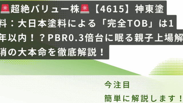 【中・上級者向け】資産バリュー株・TOB考察 🚨超絶バリュー株🚨【4367】広栄化学:住友化学による「完全TOB」のXデーは近い!?PBR0.5倍台に眠る親子上場解消の大本命を徹底解説! 皆さん、こんにちは!おトクと隠れ優良株が大好きな、ゆずママです🍋今日は、私のバリュー株センサーが「これは将来の大化け候補!」と激しく反応している、とっておきの銘柄をご紹介します。その銘柄とは…【4367】広栄化学(こうえいかがく) です!「... 2026.03.05 【中・上級者向け】資産バリュー株・TOB考察バリュー株