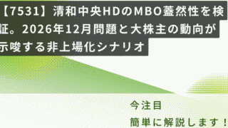 【中・上級者向け】資産バリュー株・TOB考察 【7531】清和中央HDのMBO蓋然性を検証。2026年12月問題と大株主の動向が示唆する非上場化シナリオ みなさん、こんにちは。割安株(バリュー株)の分析を行っている投資家、ゆずママです。いつも当ブログをご覧いただき、誠にありがとうございます。バリュー株投資において、市場から本来の価値よりも低く評価されている銘柄を見つけ出し、その価値が見直され... 2026.03.24 【中・上級者向け】資産バリュー株・TOB考察バリュー株