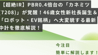 【中・上級者向け】資産バリュー株・TOB考察 【超絶IR】PBR0.4倍台の「カネミツ(7208)」が覚醒!46歳女性新社長誕生&「ロボット・EV銘柄」へ大変貌する最新中計を徹底解説! こんにちは!ゆずママです✨いつも「ゆずママの資産バリュー株ガチ投資&株主優待生活」をご覧いただき、ありがとうございます!本日(2026年3月24日)、引け後に私がディープバリュー株として大注目していた**カネミツ(7208)**から、とんで... 2026.03.31 【中・上級者向け】資産バリュー株・TOB考察バリュー株