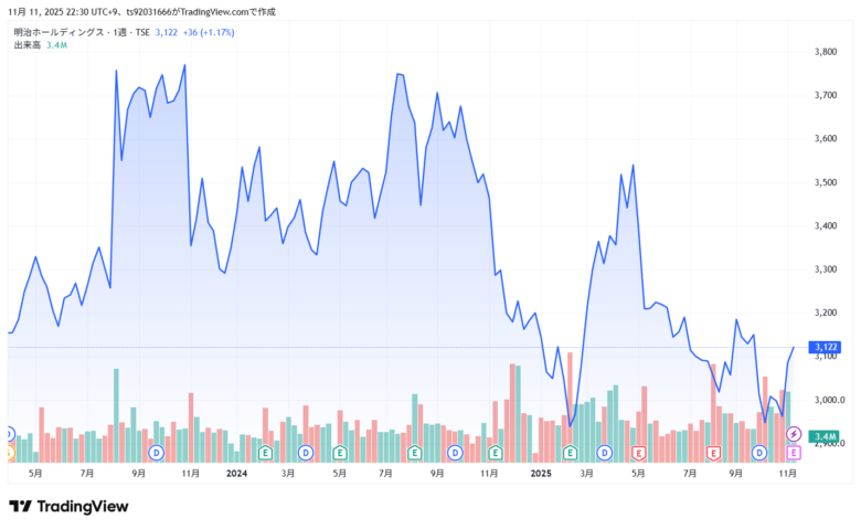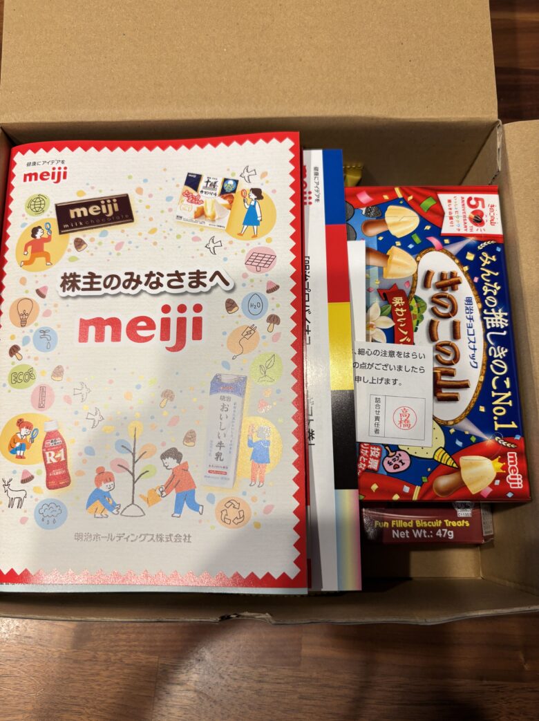 3月末権利確定銘柄【明治ホールディングス】の株主優待が2025年10月26日(日)にヤマトにて到着しました。100株の保有なので1,500円相当の自社商品と商品引換券です