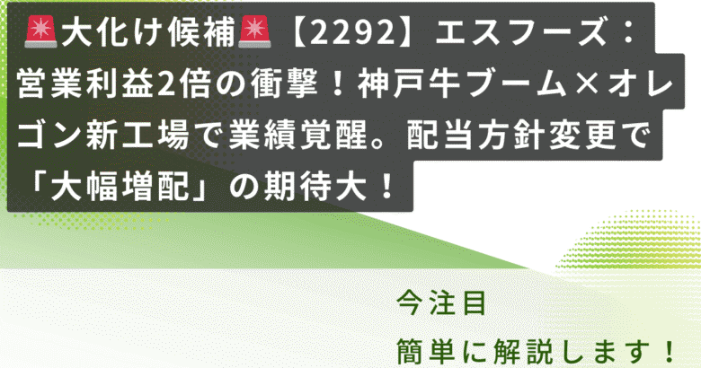 実はエスフーズ、今や「世界に和牛(神戸牛)を売り込むグローバル企業」へと変貌を遂げており、さらに「オレゴン新工場の稼働」「アメリカ産牛肉の価格下落(利益率改善)」「配当性向の変更」という、株価爆上がりのトリガー(カタリスト)がこれでもかと詰め込まれた、超・お宝銘柄なんです。