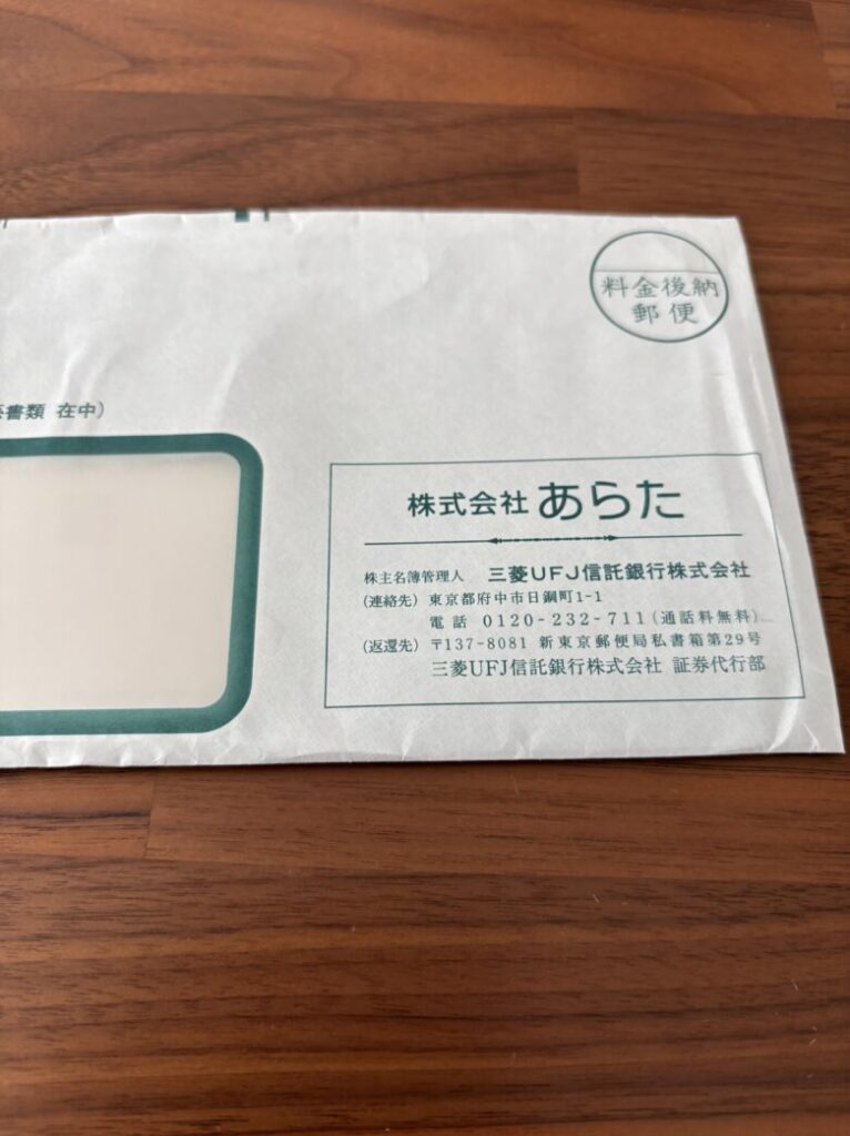「株式会社あらた」と書かれた、グリーンのラインが入ったシンプルな封筒です。