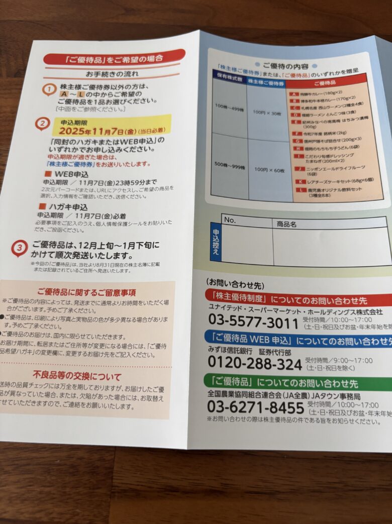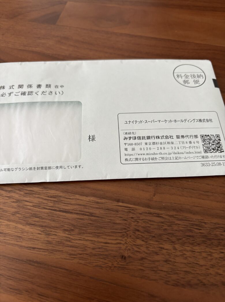 8月末権利確定銘柄【ユナイテッド・スーパーマーケット・ホールディングス】の株主優待案内が2025年10月20日(月)に郵送にて到着しました。100株の保有なので3,000円相当の割引券もしくは1,500円ぐらいの商品です