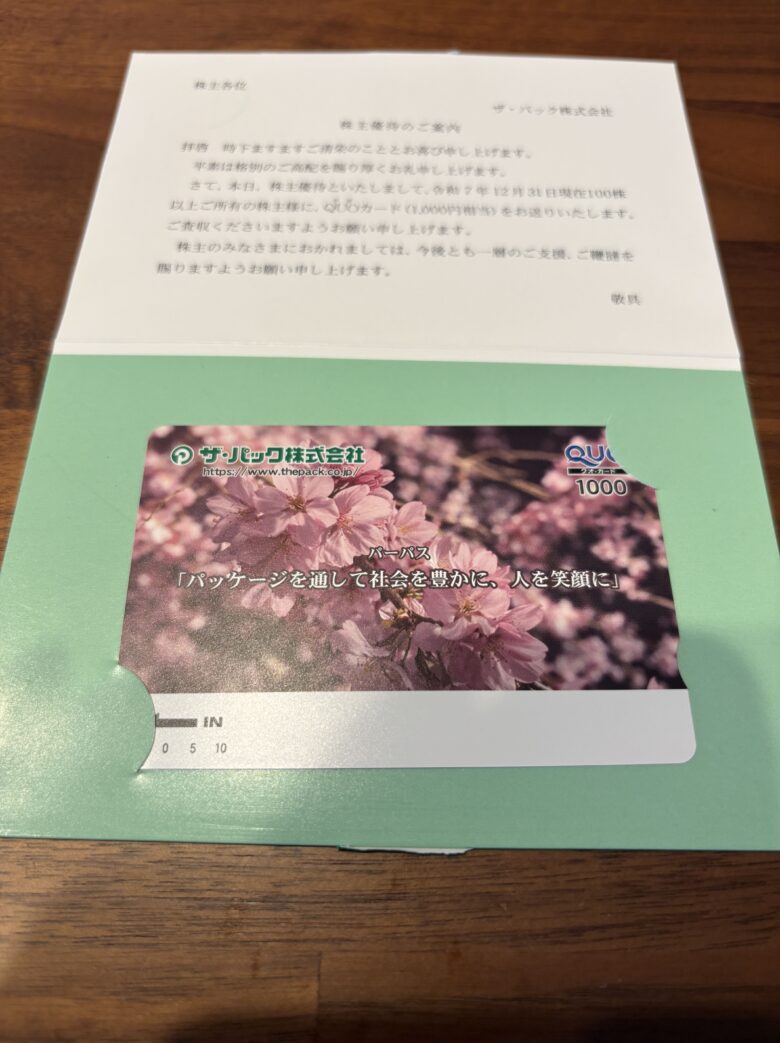 昨年末(2025年12月末)に100株を保有していた私のもとに届いたのは、使い勝手抜群の1,000円分QUOカードです。