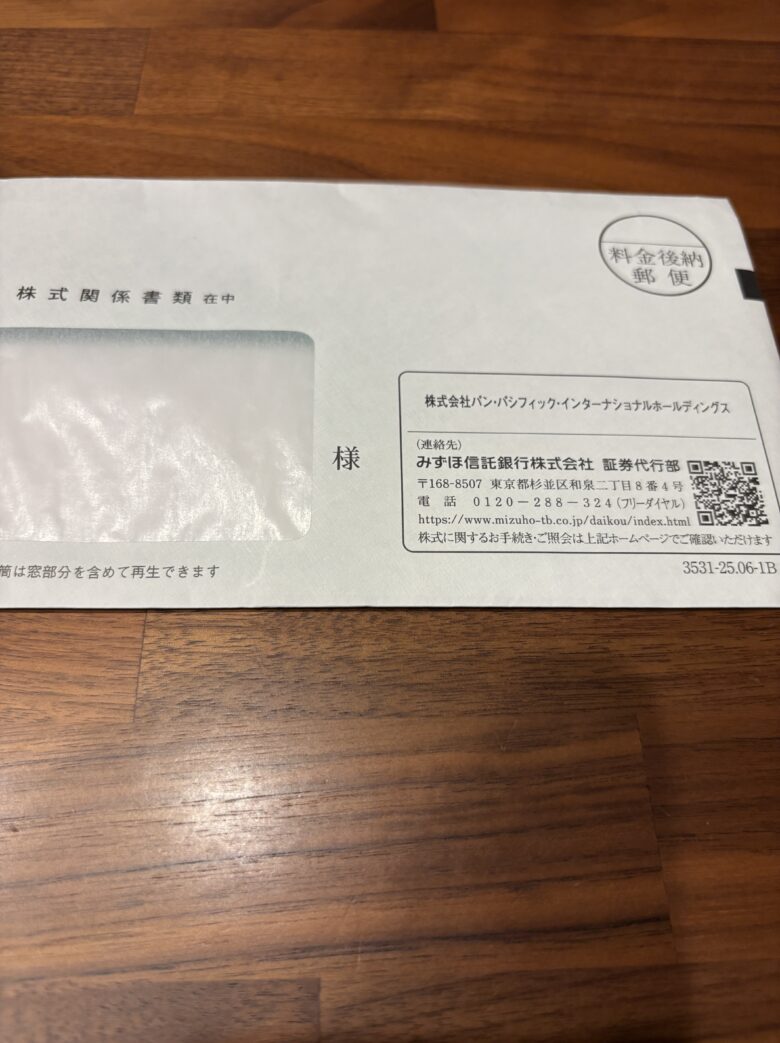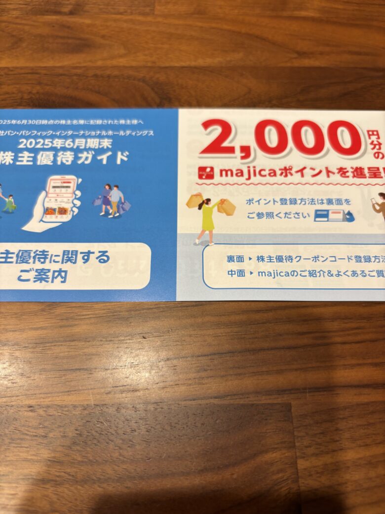 6月末権利確定銘柄【パン・パシフィック・インターナショナルホールディングス】の株主優待が2025年9月29日(月)に郵送にて到着しました。100株の保有なので2,000円分のポイントです