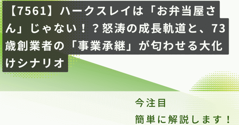 お弁当チェーンからの鮮やかな脱却、怒涛のM&A戦略、累進配当の安心感、そして「73歳創業者の事業承継」という水面下の最強カタリスト。ハークスレイ(7561)は、表向きの業績成長を享受しながら、裏側にある資本のダイナミズム(非上場化・大再編)にも期待できる、バリュー投資家垂涎の銘柄だと言えます。