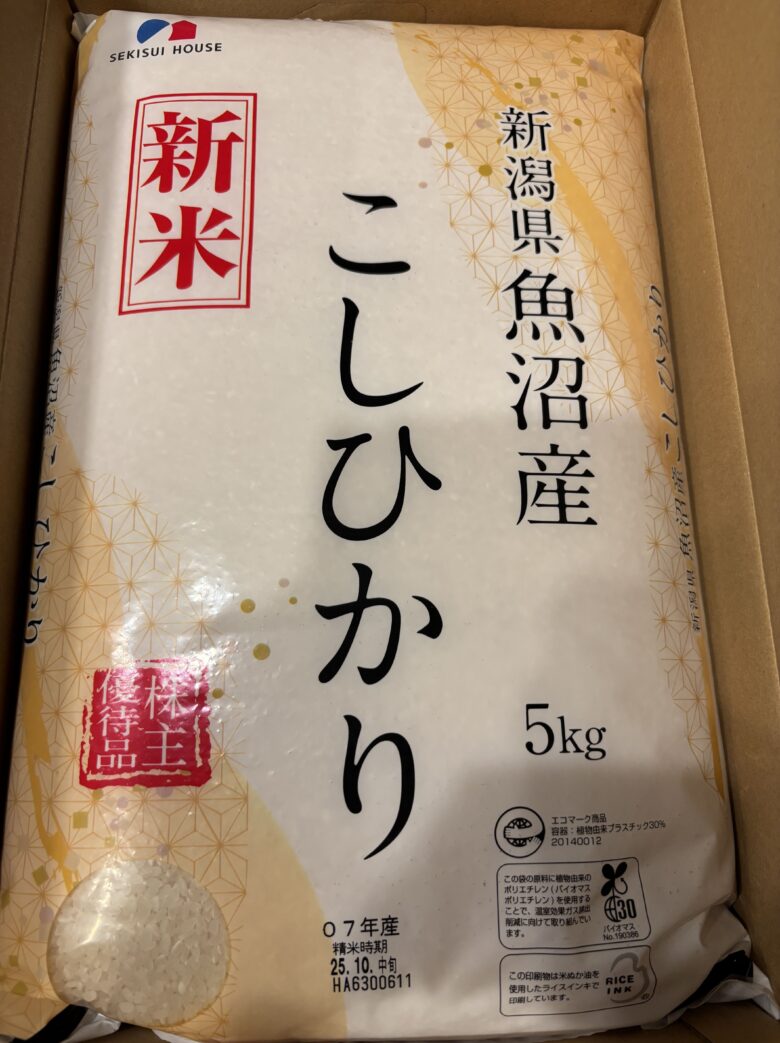 1月権利確定銘柄【積水ハウス】の株主優待が2025年10月25日(土)ゆうパックにて届きました。100株の保有で5kgの魚沼産コシヒカリとなります。