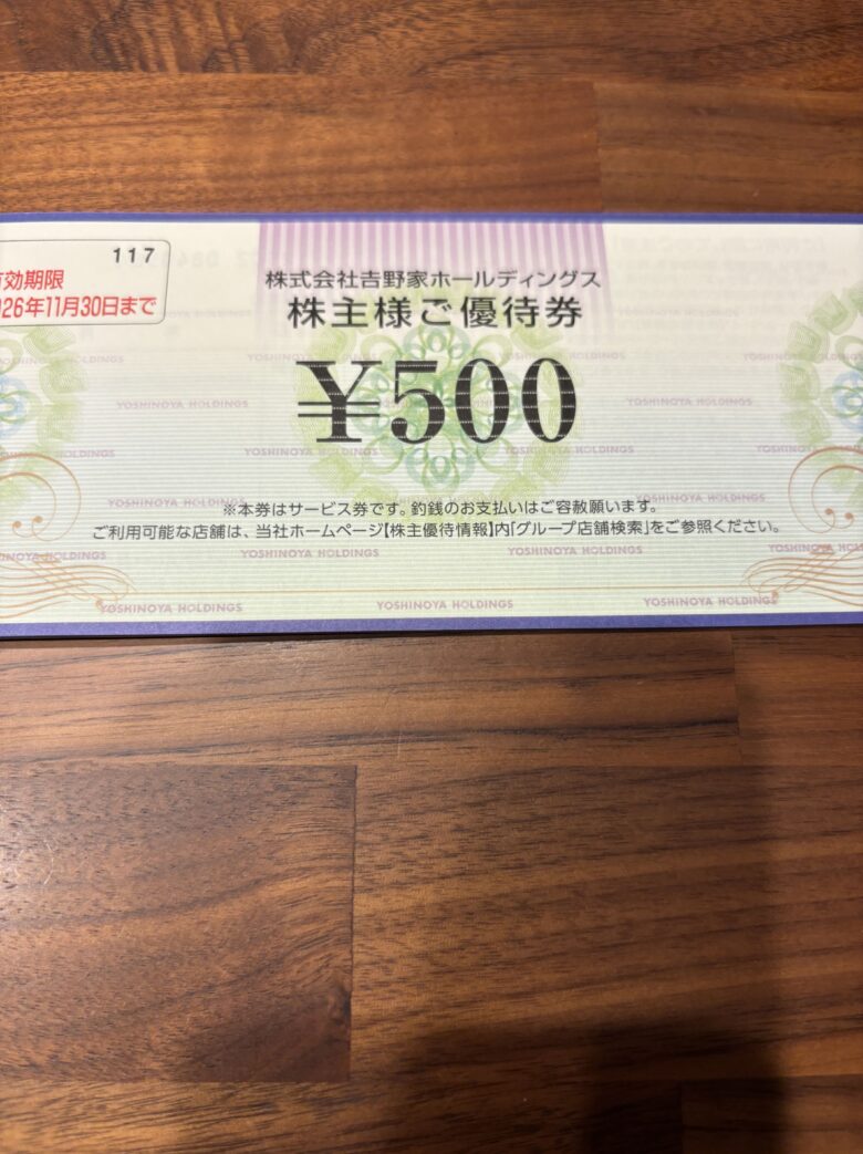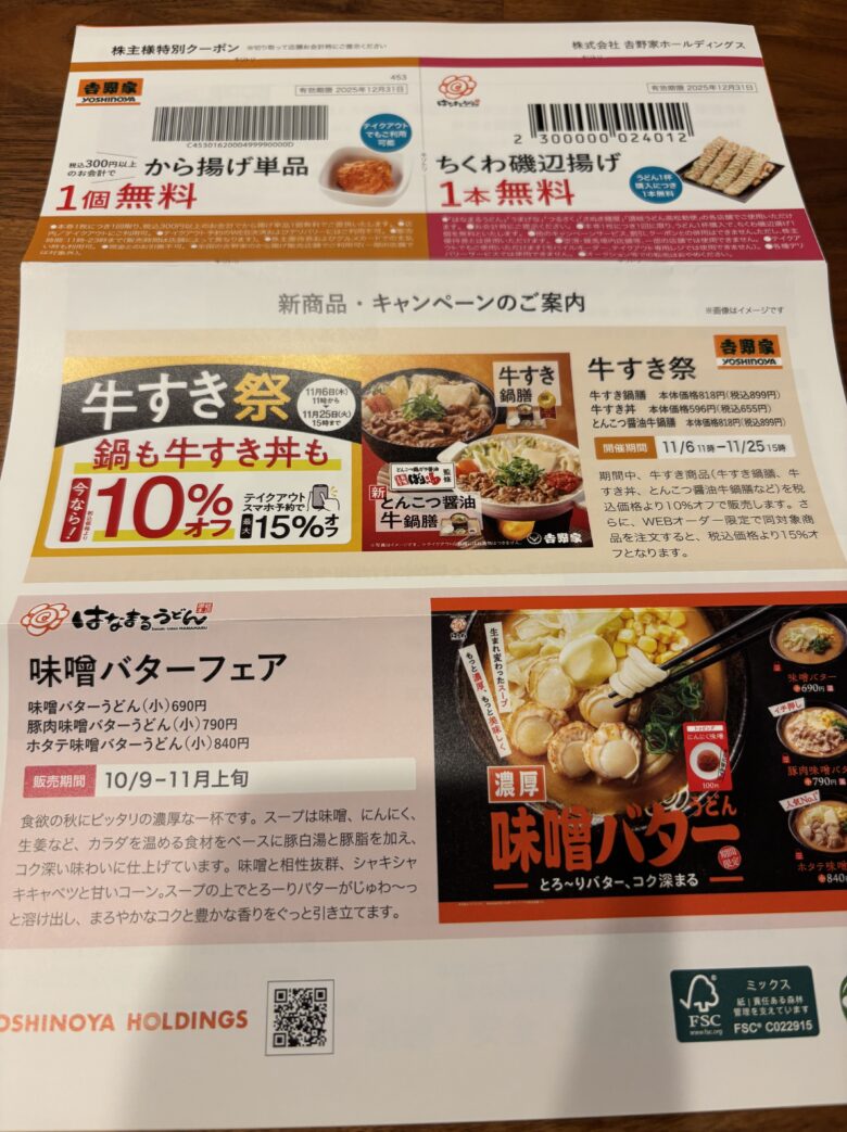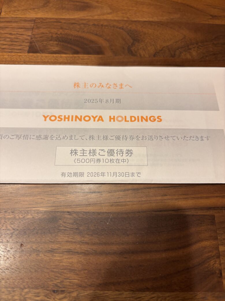 8月末権利確定銘柄【吉野家ホールディングス】の株主優待が2025年11月10日(月)に郵送にて到着しました。200株の保有なので5,000円相当の食事券です。
