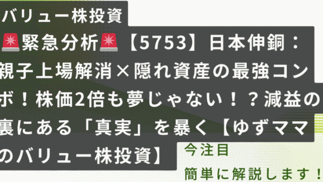バリュー株 🚨緊急分析🚨【5753】日本伸銅:親子上場解消×隠れ資産の最強コンボ!株価2倍も夢じゃない!?減益の裏にある「真実」を暴く【ゆずママのバリュー株投資】 皆さん、こんにちは!おトクと隠れ優良株が大好きな、ゆずママです🍋今日は、私が今**「これぞバリュー株の王道!」**と興奮して鼻息を荒くしている(笑)、とっておきの銘柄をご紹介します。その名は…【5753】日本伸銅(にっぽんしんどう) です!... 2026.02.26 バリュー株